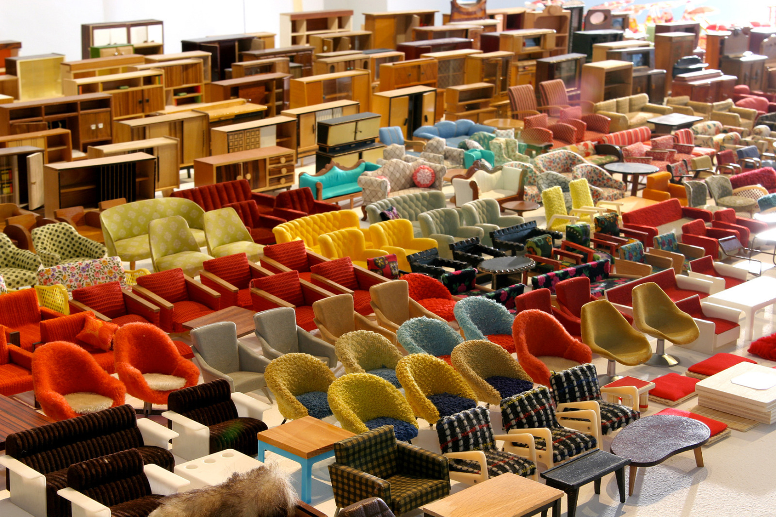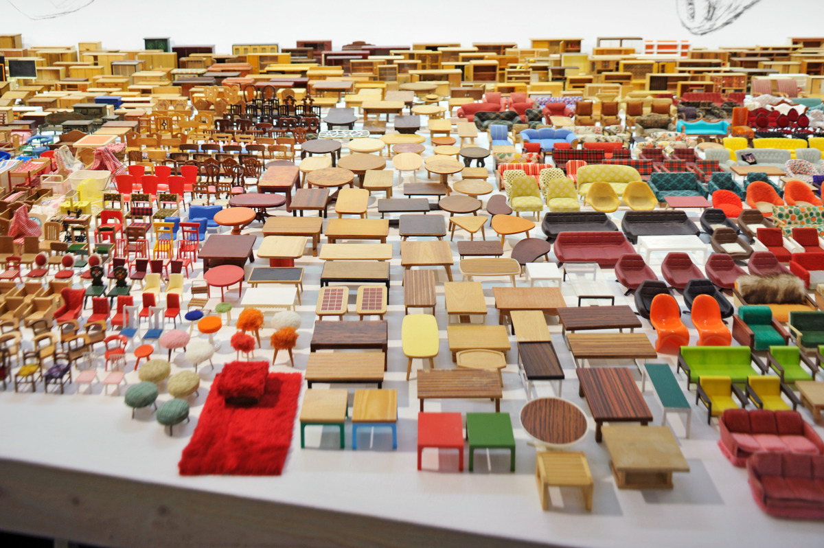 Kecsmemethy’s intention to create an image of cultural estrangement and heterogenous composition is confronted with the museum’s presentation and intensified by it. A basic aspect of a museum’s tasks is shown by the serial arrangement of a large number of second-hand miniature furniture from different periods and different cultural origins. A museum works with objects that are torn from their original context and therefore appear as stranded goods of history.