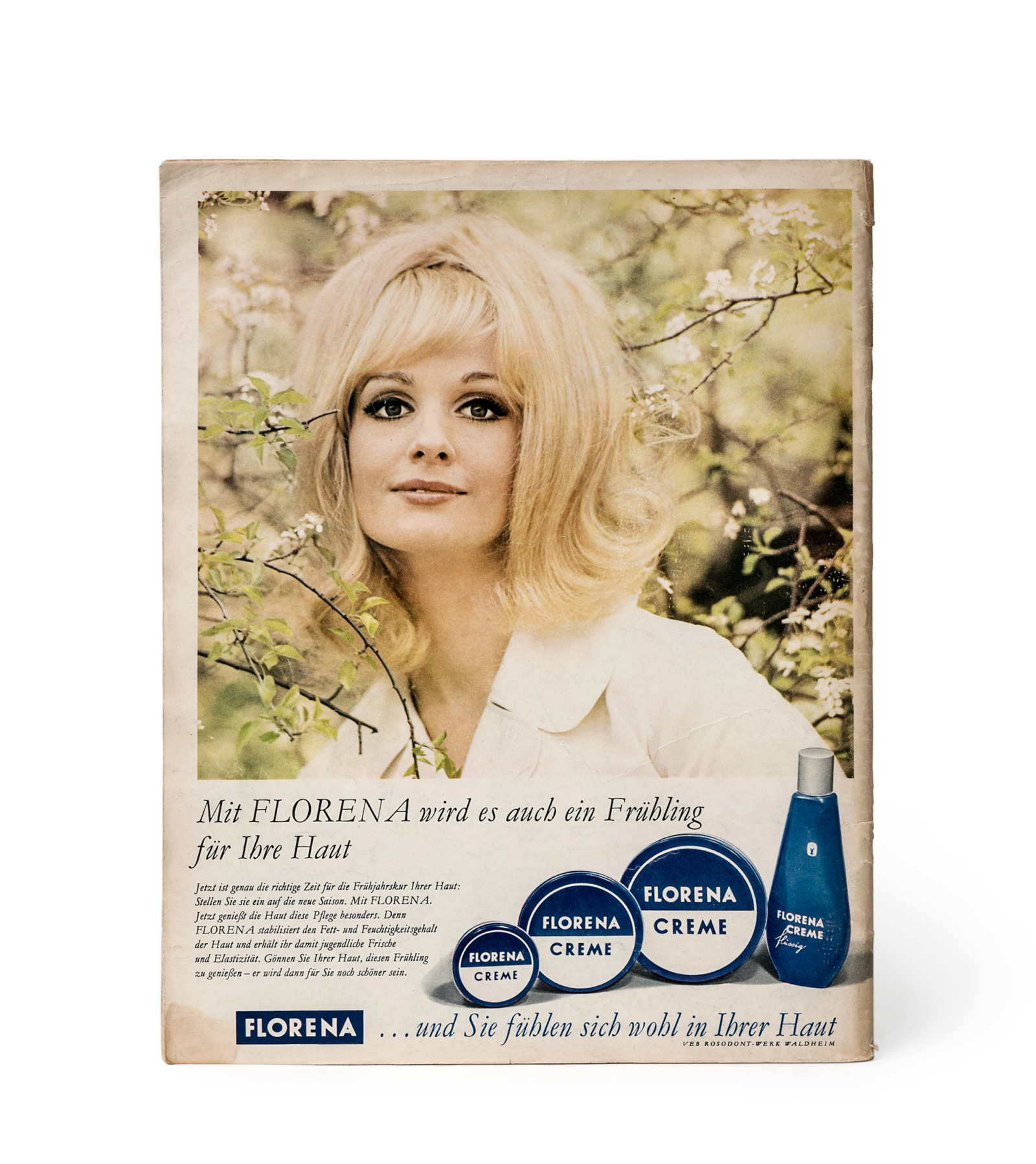 This ad, published on the back cover of “Sibylle” magazine issue February 1969, and other “Florena” products are currently on display in the special exhibition “Masse und Klasse: Graphic Design in the GDR”.