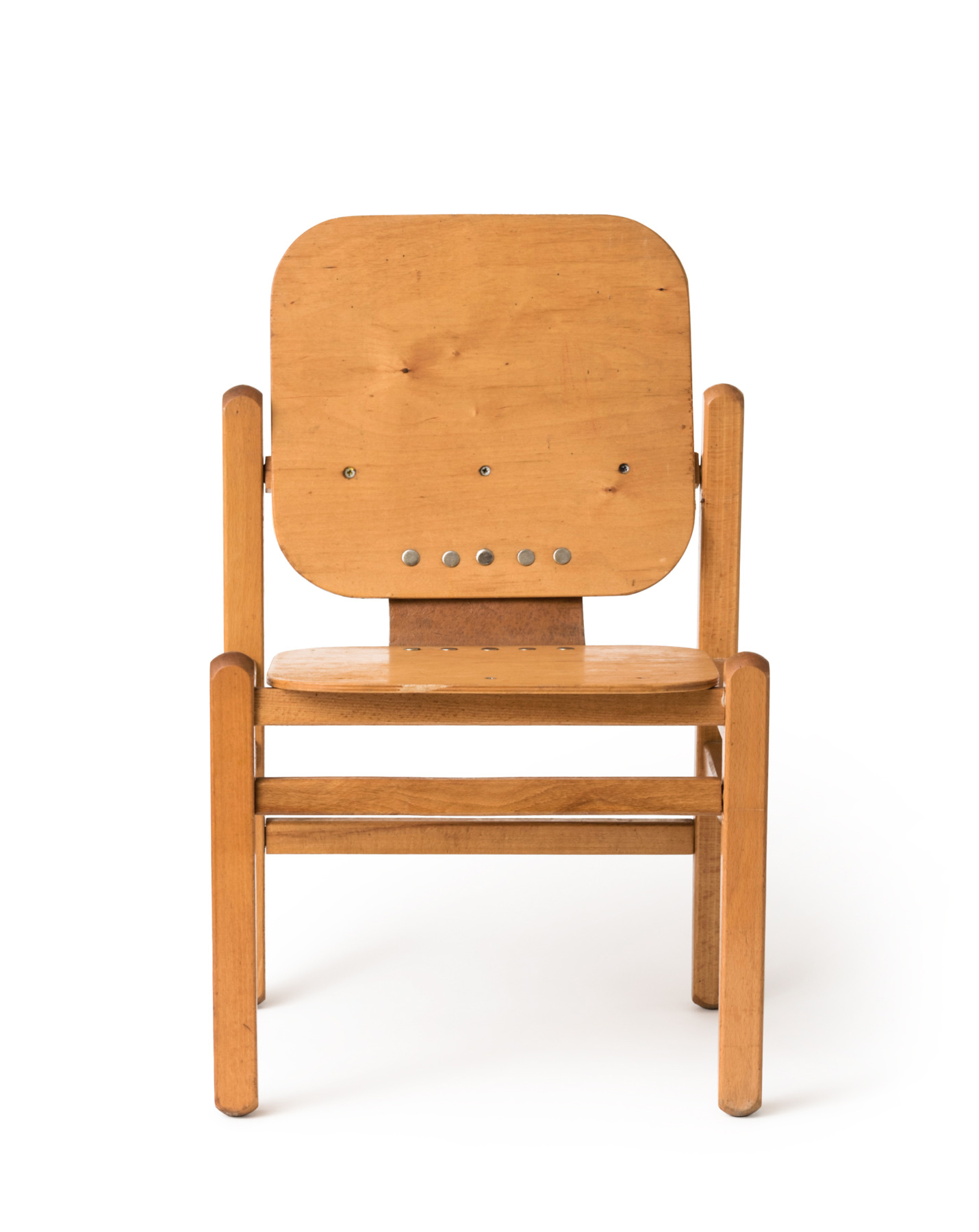 Heidi from the Erzgebirge.I am a children’s chair only 56.5 cm tall. I have a sister named Moni, who is also a children’s chair, and a brother named Peter, who is a children’s table. We were born around 1960 in Bad Suderode at the VEB Klappmöbel. I am mainly made of beech wood. What is special about me is that my seat is connected to the backrest by a piece of leather. Since the backrest has a rotating bar, I am movable and comfortable. Hans Brockhage thought this up. He first did an apprenticeship as a wood sculptor and wood turner, then studied under Mart Stam at the Hochschule für Bildende Künste in Dresden and later worked as a form designer at Burg Giebichenstein in Halle – many simply say “die Burg” (“the castle”). In 1970, he was appointed to the Fachhochschule für Angewandte Kunst in Schneeberg. Far better known than I am, is the Schaukelwagen, designed by Hans Brockhage in the early 1950s. But I am not jealous. Hans once said the beautiful sentence: Wood, that is above all an idea.
