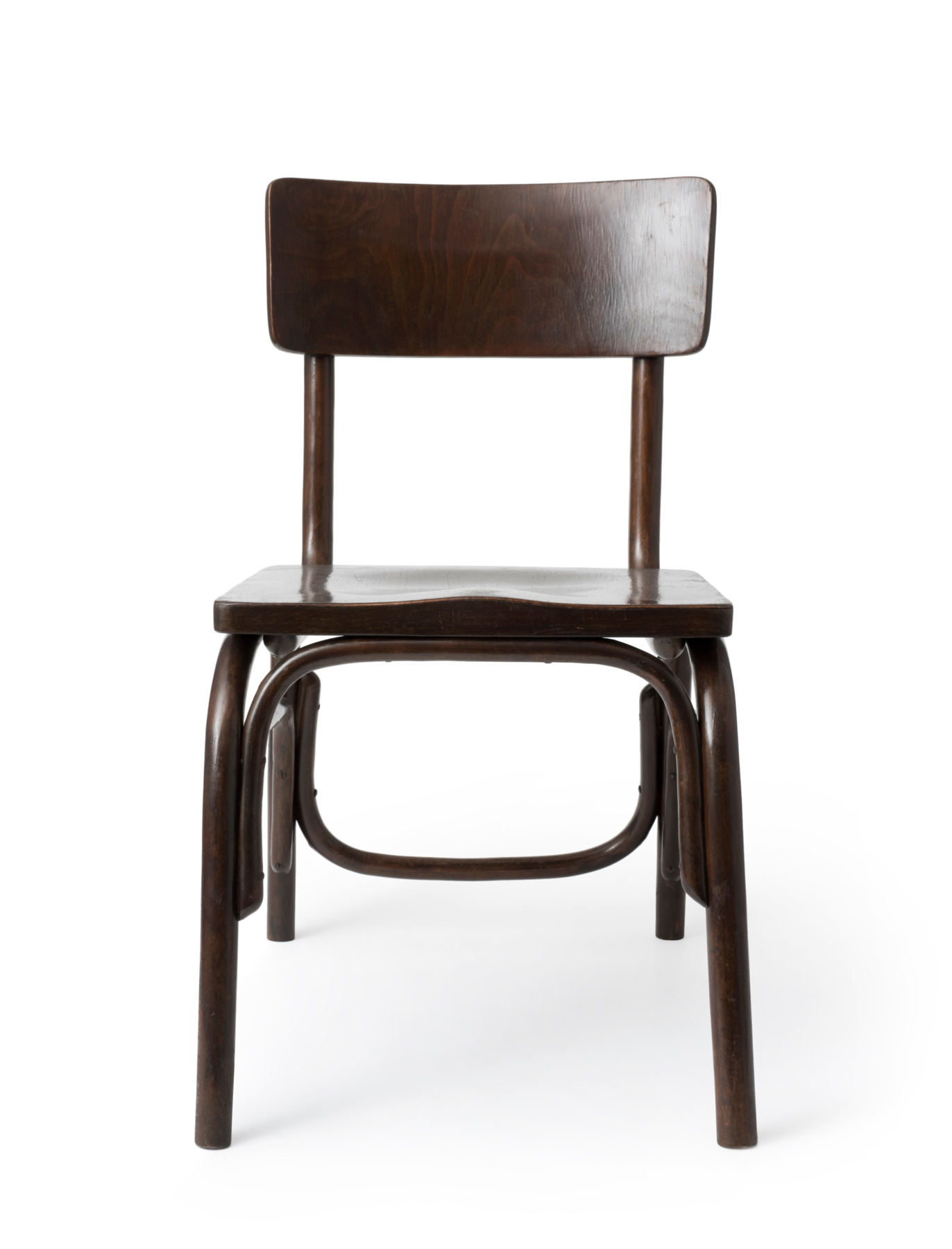 Developed during the construction of the New Frankfurt, it was initially used in the vocational education centre. As opposed to the conventional desk chairs and delicate coffee house chairs from the Thonet brothers, the so-called “Kramer Chair” was primarily designed for comfort and stability. Legs and struts are made of bentwood, while backrest and seat are made of dark stained and varnished plywood.