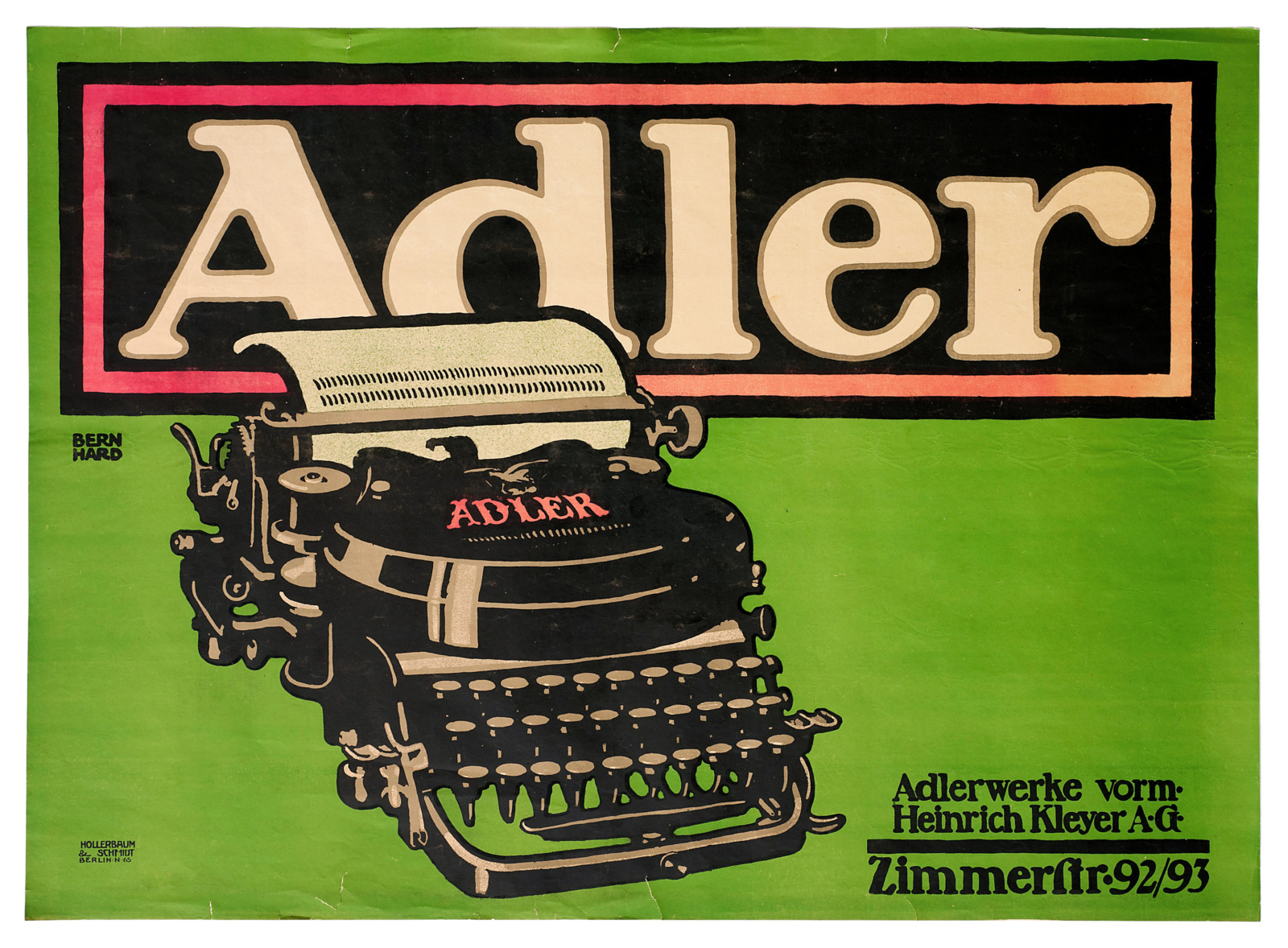The illustrator and Bernhard specialist Hubert Riedel commented on the poster and the placement of the typewriter: “On a poison-green background, it was set diagonally in black into the horizontal sheet. Over the entire width of the poster in a square, also framed in black and dark pink, the name Adler in white stood large in upper and lower case letters and was easy to read from some distance. Only the address of the Berlin representation (and sales outlet) of the Frankfurt am Main-based factory was shown at the bottom right of the poster.” This reduced representation, which only showed the product and the name of the company, soon became known throughout the world as the Berlin style, and Bernhard moved the functional poster into the spotlight of modern advertising graphics.