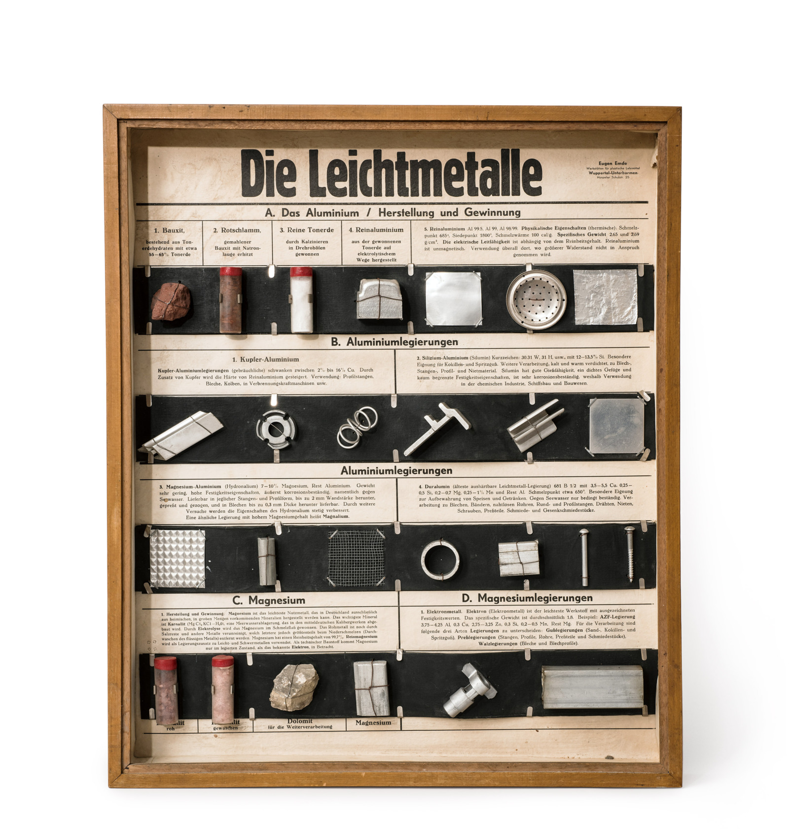Around 1900, German publishers who issued textbooks also specialized in the production of teaching kits, globes and wall maps. Large numbers of such teaching kits from Räths Technologische Sammlungen or from Eugen Emdes Werkstätten für plastische Lehrmittel were manufactured for school lessons, vocational education or museums. Inside these cases, not only a single material is presented, but also its extraction, processing and residue utilization. Contrary to the ideal of a comprehensive education with tangible materials, the objects are now behind glass: similar to a museum, sensual perception is reduced to a merely visual level. This paradox of material education without material experience is presumably the reason why this type of teaching kit has vanished from the classroom: since the 1970s, these old-fashioned educational tools have been gathering dust in schools’ aisles or depots.
